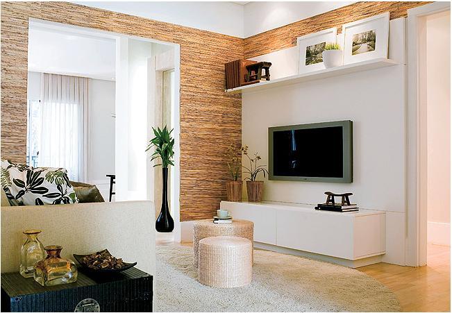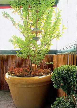 Repare que o painel de bambu, além de promover um acabamento bacana, destaca a composição formada pela cerejeira com forração de periquito-vermelho, plantadas no vaso de cerâmica