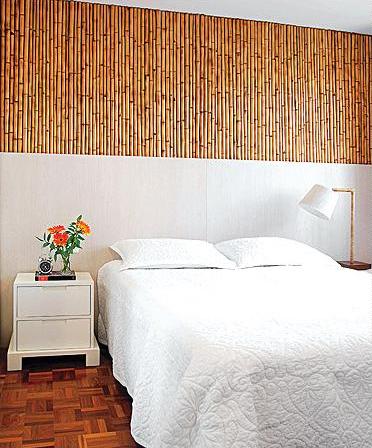 A parede do quarto foi toda revestida de bambu, proporcionando um ar mais natural ao ambiente