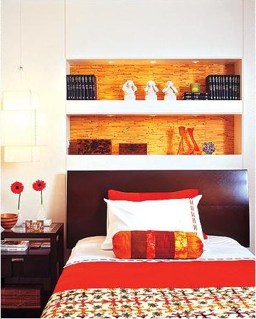 Estante diferenciada: nichos com fundo de bambu (1,20 x 0,30 m) acomodam livros, caixas e peças decorativas. Projeto e execução da Spazio Arquitetura