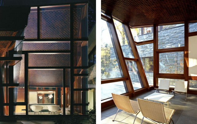 Além do vidro do pavilhão central e da pedra dos volumes laterais, a casa Glenbrook, como é chamada, é marcada por finos pilares de metal, além de portas externas feita com aço corten. São elas que conectam todos os ambientes sociais à densa floresta que rodeia a mansão e que, nas áreas com fachada inclinada de vidro, parece estar dentro da casa.