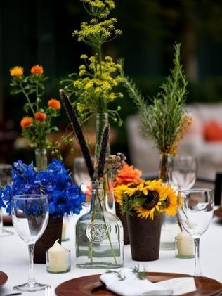 - Faça as garrafas pequenas de refrigente ou cerveja de vasinho, colocando apenas uma flor em cada uma. Rosas e gérberas são ótimas opções