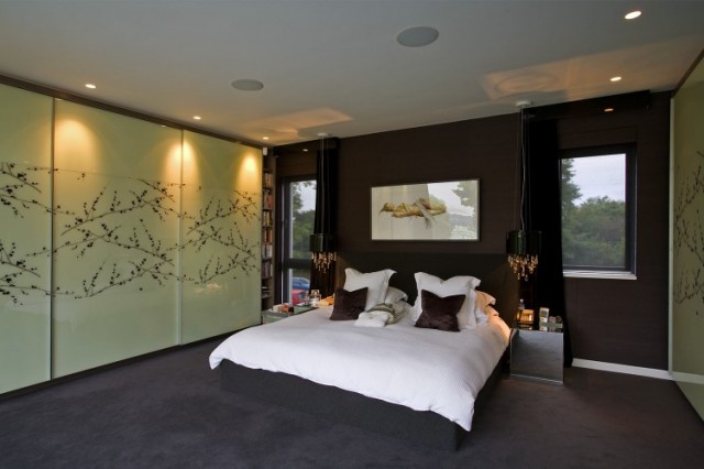 No segundo pavimento, a suíte máster é rodeada por saletas envidraçadas com vista para o bosque e conta com um banheiro de mais de 30 m². Os três quartos dos filhos, por sua vez, são inteiramente adaptados para crianças – um para meninos, e outros dois para meninas. Até neles, o espírito minimalista é preservado, graças à elegância e sobriedade das cores e dos padrões.