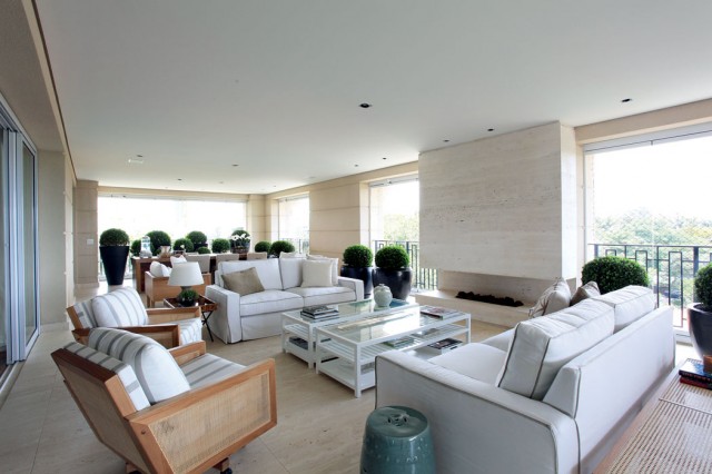 Às margens do Rio Pinheiros, em São Paulo, fica esta varanda de um imenso apartamento decorado pelo arquiteto Dado Castello Branco. Fechado com vidros, o espaço se transformou em uma arejada e iluminada sala de estar. A leveza se faz presente nos móveis, de ligeira inspiração campestre, confirmada pelos vasos que margeiam o ambiente. Ao fundo, um bar com poltronas faz deste o lugar ideal da casa para os momentos de descontração em família.